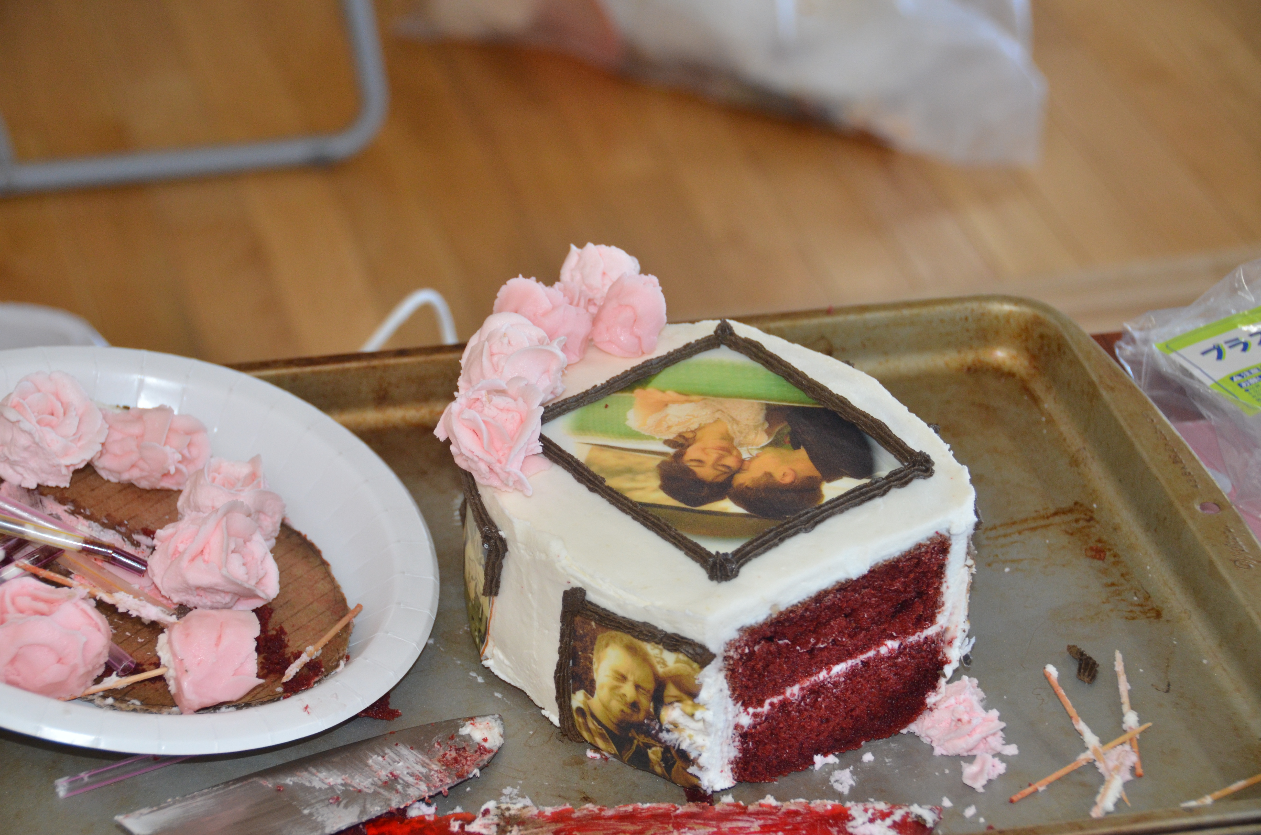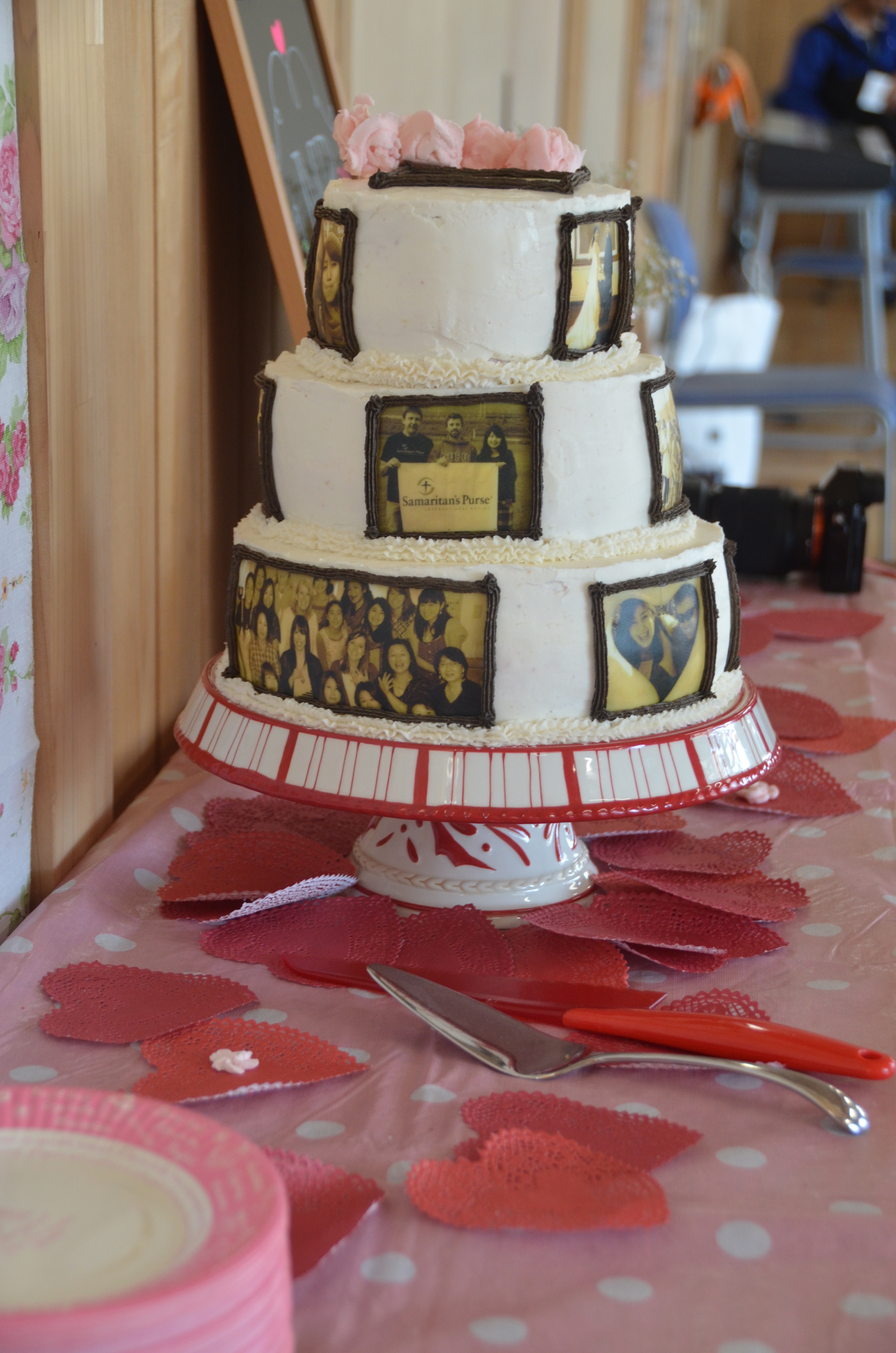 We did a crumb-frosting on each layer and then the “real” smooth frosting (my best method for this is a glass of very hot water that I dip the spatula into to help smooth things – still working on this!). I cut out the icing photos just before applying them onto the cake, and made a sepia-brown icing for the border of each photo. I inserted straws into the bottom two layers to support the tiering (again using advice from various websites). I waited until we transported the cakes to the venue to actually stack them, add the borders, and add the roses.