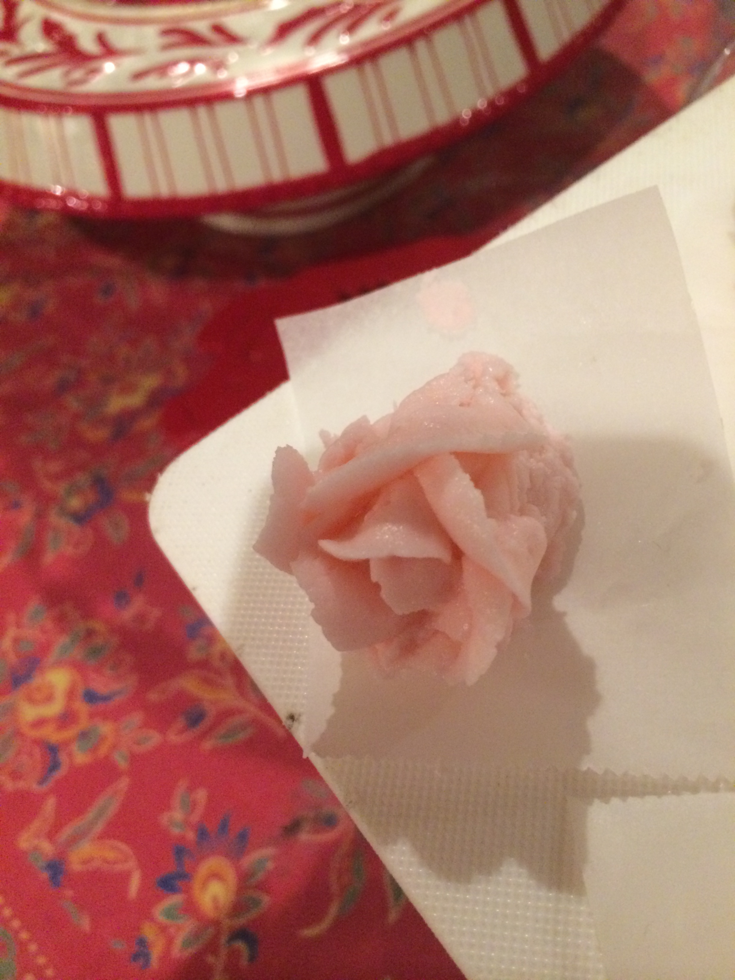 I wanted to do a cascade of roses – but I’ve never made roses before! So Friday night I watched some YouTube gurus and sort-of self taught myself. I made a few more on Saturday night. I used a buttercream frosting for the cake frosting and the decorations. (My basic recipe is: 4 C confectioner sugar, 1 C combo of shortening and butter – less butter as it gets more humid outside; milk or cream until it gets creamy; 1-2 t. vanilla).