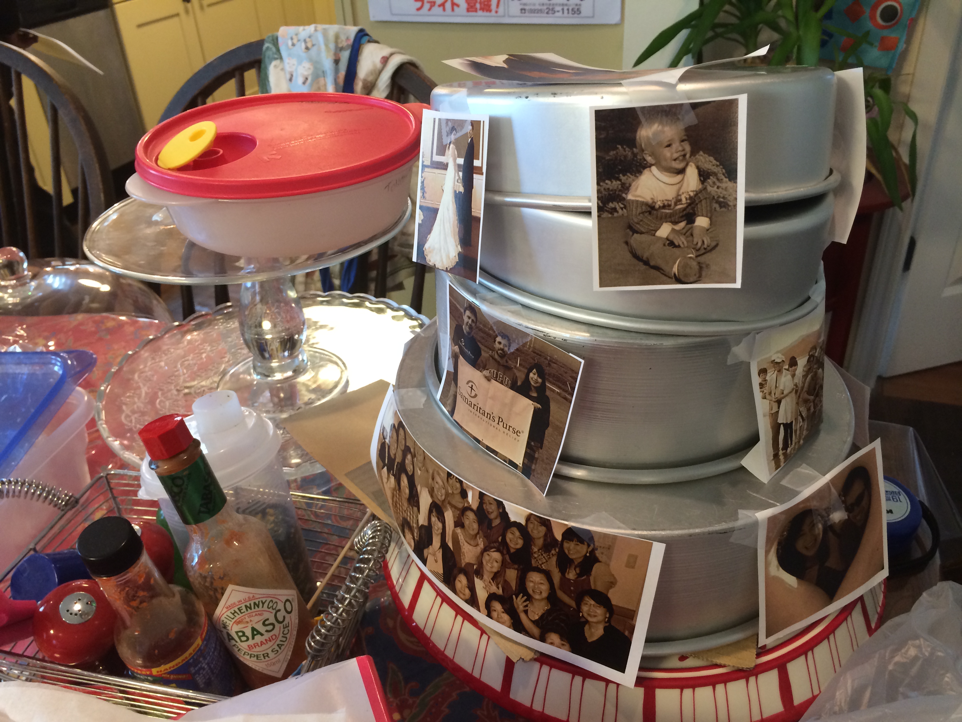 The process of finding a place to print the photos was a bit of a challenge. I knew I wanted to make some kind of tiered sepia photo wedding cake (I had made a similar one for my dear friend Lyn a number of years ago). I first ordered the pages through ebay in the UK two weeks ago, but they took too long to respond and couldn’t ship them in time. Then my friend Shirlee in LA found a bakery to do it, but the shipping would have been $100. Eeks. Then we finally found a reluctant cake man down in Tokyo who agreed on the promise of secrecy to make and send the three pages of sepia icing sheets, but he had problems with his printer and was more than relieved when our friends the Browns offered to bring them back from San Diego this week! They got them at the local Albertsons and flew them back; I picked them up in Sendai on Friday and decorated on Saturday – just in time!
