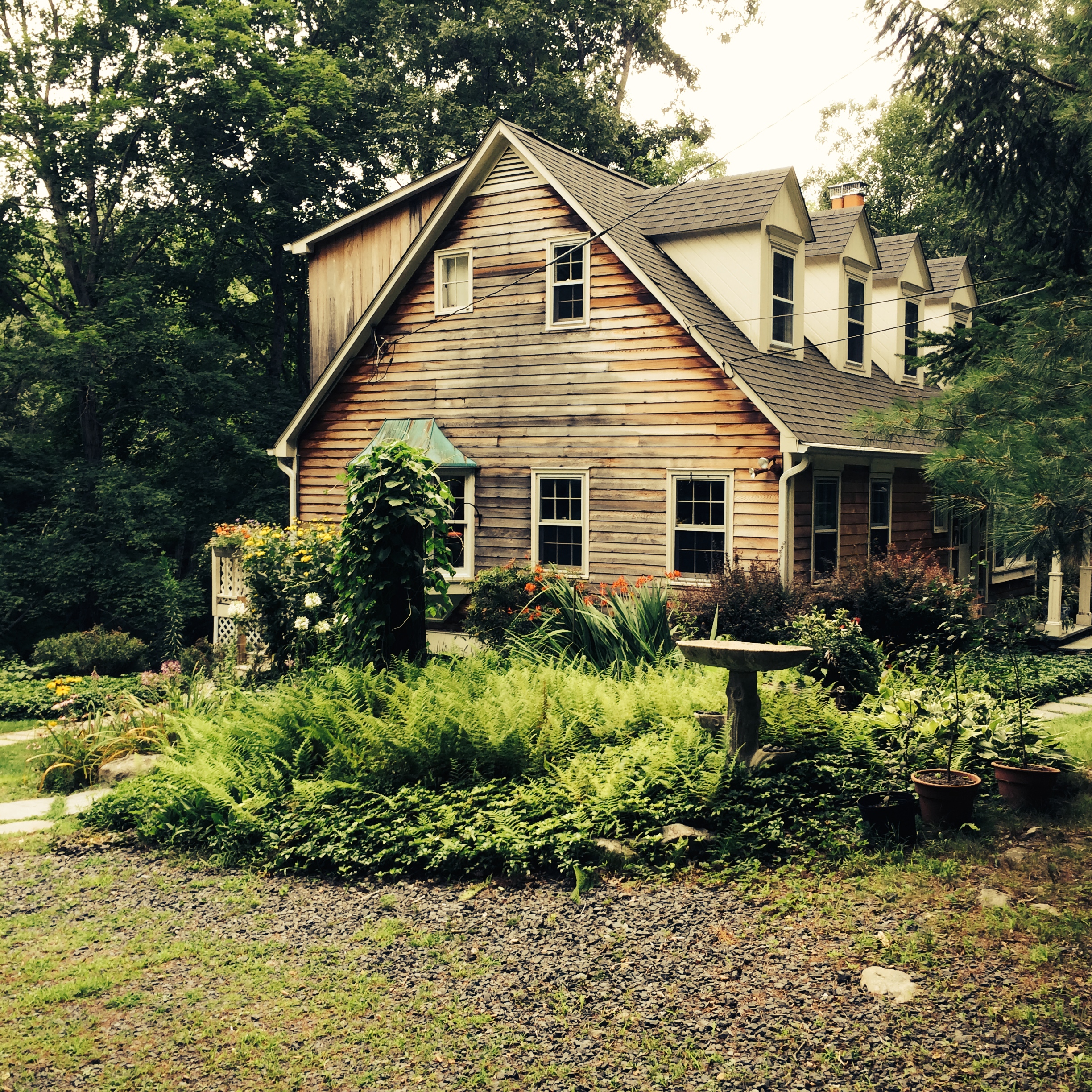 On our way out of town we went out of way to pilgrimage as a family …to the Pocono property that our family had owned for many, many years.  My parents had built from scratch a home at the top of the stream;  this land was where we had spent most every family vacation that I can recall after our return from Africa.  We had to take a 40 minute detour to get there, at one point even moving a detour sign to drive around it!  — I am sure all three of the brother-in-laws were mumbling under their breath but went along with us anyway.  And we finally drove our vehicles down the still-rutted wooded long driveway into the property.  We pulled into the top of the hill and saw the charming cabin that my parents had built fifty years ago.  It has different wood siding and two more dormer windows and is adorable – we were all so sad that they had sold it all those years ago!