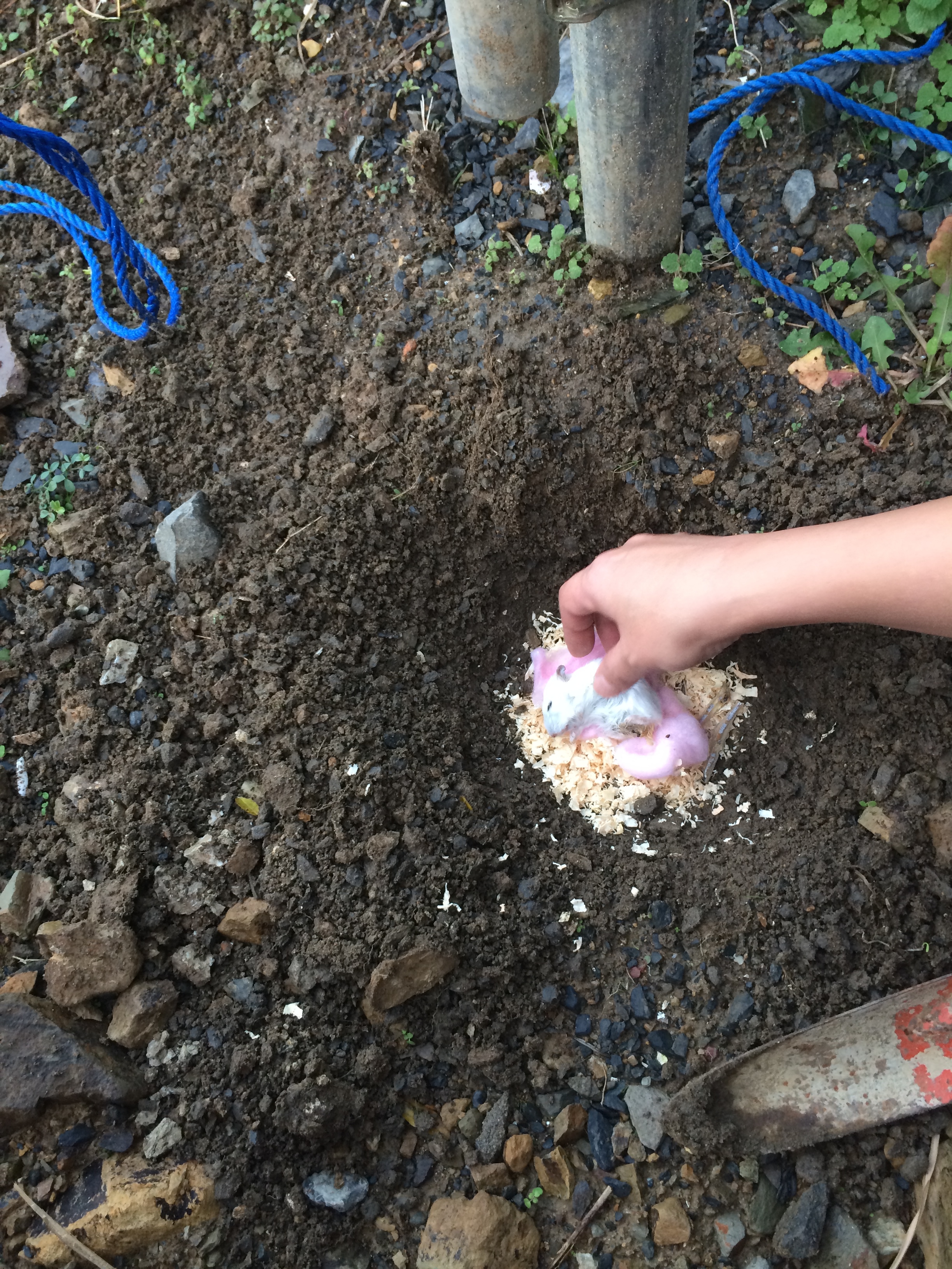 Annie, H, and H’s sister gave Nana the Hamster a proper burial!