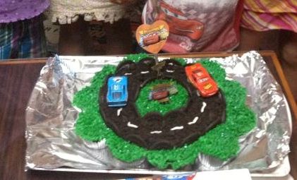 Ian’s third birthday.. a Car’s racetrack made out of cupcakes.