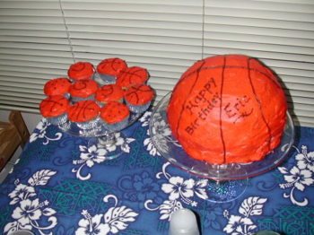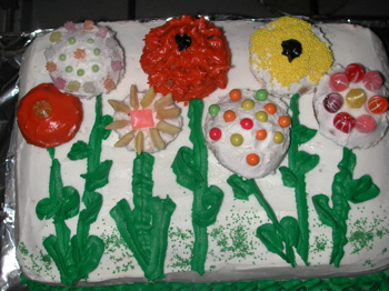Owen wanted a Super Mario birthday party… This cake was my earliest-morning-cake to date before the Up cake (4 am!). Eric made a stencil outline that I cut into pieces to put the face and body together. The mushrooms were fun– chocolate cupcakes with red frosting and cut-up marshmallows. Doing a number of different-colored icings took longer than some other cakes, and making character cakes NOT look like a cheap knock-off is always the most time consuming for me…
