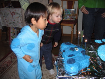 Owen’s third birthday cake: (with his friend Toby blowing out the candles)