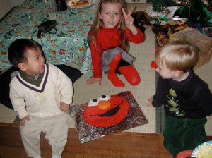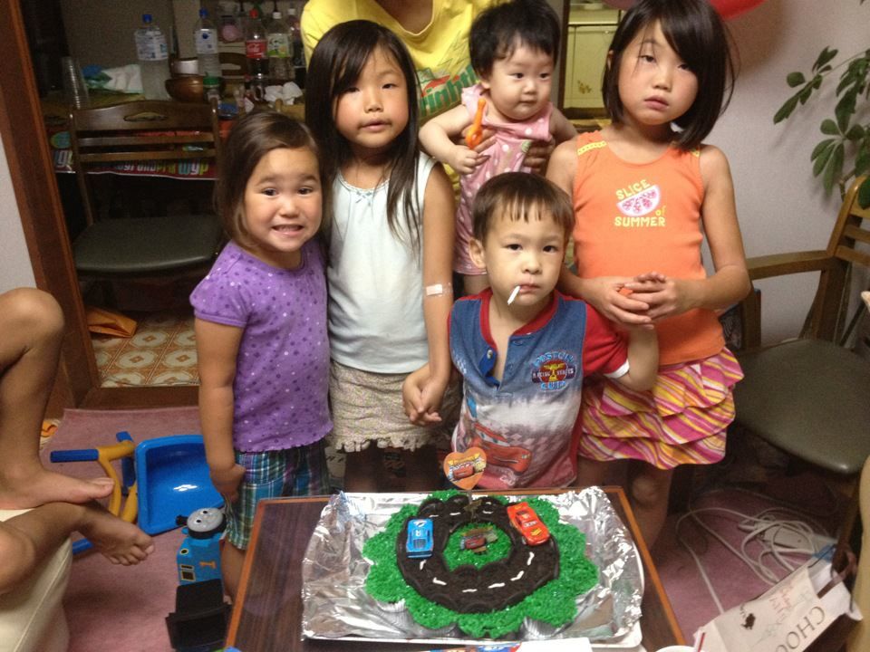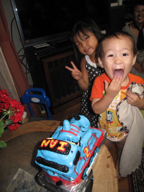 It was a very hot Japan September day, and by the time of the party the next afternoon, when i went to retrieve the cake – we had a train wreck. Eric helped me try and repair it, but still… The great thing was – Ian didn’t care about the melted parts that pulled the train apart – he thought it was the greatest thing. Now whenever he hears “Happy Birthday” he starts talking about his Thomas cake.