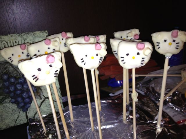 Her second birthday this year she shared with a friend. My sister gave me the idea from the US to make cake pops. Rather than the ultra-sweet recipe, I used a type of sweet, dense breakfast cheese bread that I sort of squished to make the shape of kitty’s head, then dipped it in melted white chocolate (use a double boiler, NOT the microwave!), and then used candies and chocolate jimmies for the faces. We can’t buy lollipop sticks here, so I used individuals chopsticks.