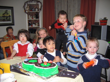 Owen wanted his ninth birthday to be a special “last” one in Sanda with his special friends. So I ordered a photo sheet for the top of the cake with pictures of his friends who would be coming to the party. It is so simple but o one in Japan has seen it before.
