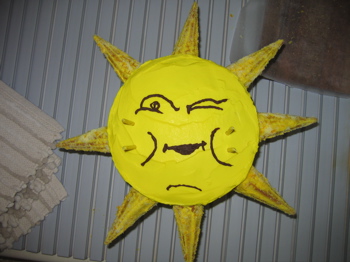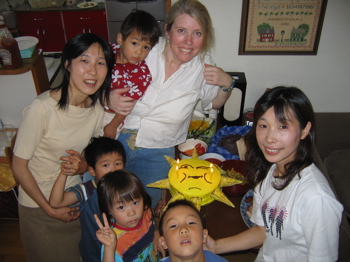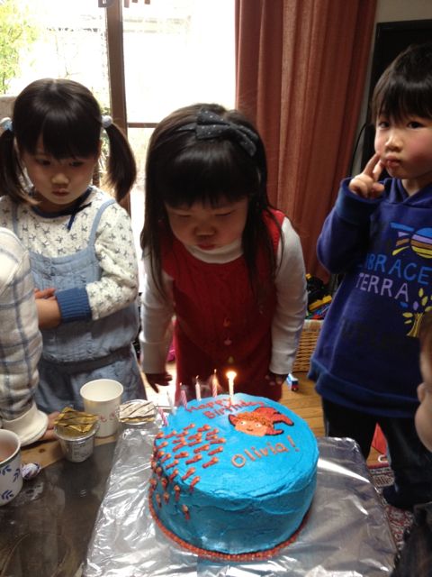 Olivia had two birthday parties this year – one before we moved from Sanda so that we could have sort of a goodbye party with her friends…. For this I chose the theme of Ponyo, one of Miyazaki’s wonderful movies that Olivia loves. Eric made a piñata for it, using a round balloon and paper mache. All of Olivia’s friends loved their first piñata experience, though the moms hate seeing it destroyed!