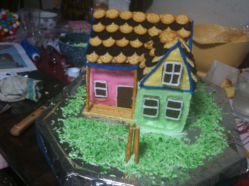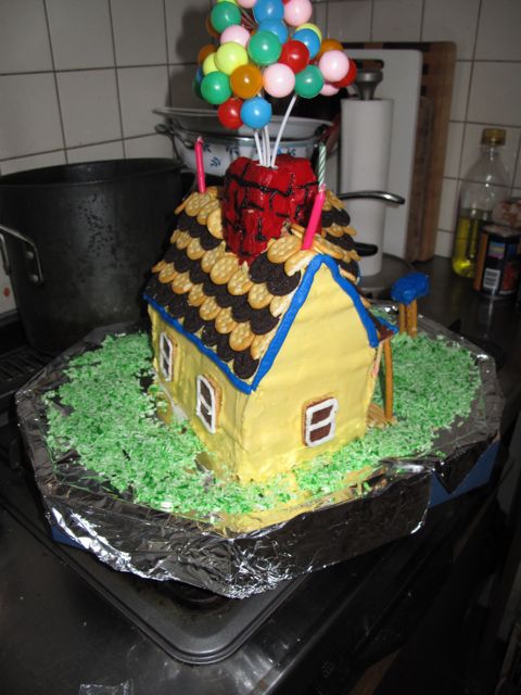 To make Carl’s house, I used 4 large loaf pans that Eric helped me cut to make the roof lines, chimney, and mailbox. It was fun to go through the grocery store here and find small cookies for the roof, and pretzel sticks for the porch, columns, and mailbox. Coconut dyed green made the grass. I broke one of my rules and used something on the cake that wasn’t edible — the balloons. (yeah Ebay!). The challenging part was sticking the balloons into the chimney — Eric taped them onto chopsticks and stuck it through the chimney and cake, but they made the chimney bulge and almost fall apart. This was one of my latest cake nights ever – making 3-D cakes where you need to decorate all sides takes a long time –but I loved making it for Olivia!