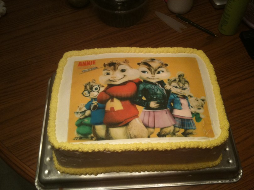 Last year we were in L.A. and I didn’t have a lot of supplies so went simple with her cake. I took advantage of being there and ordered an edible cake topper that I had designed on the computer… a graphic of the Chipmunks and the Chipettes, and then I changed the wording to put Annie’s name on the cake. I sent it off and got it back two days later and the rest of it was very easy.