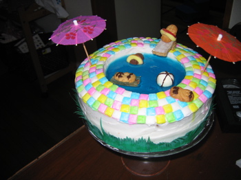 A swimming pool birthday cake for a combined birthday party for Annie’s first birthday and our friend Peter (except Annie was sick and couldn’t attend her own birthday party). I used Japanese chicklets for the pool tiles, and blue jello filled the inside of the cake.