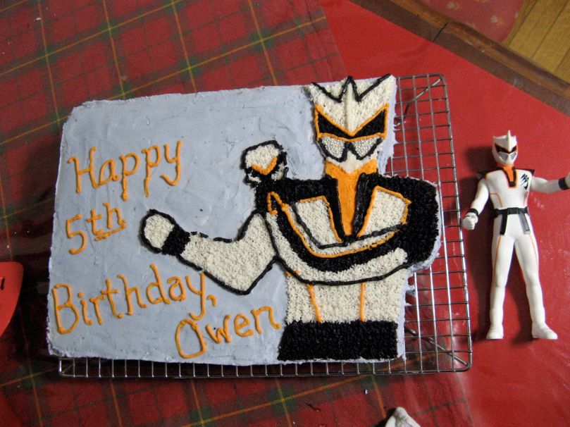 Owen’s fifth birthday cake: a Japanese power ranger called “Power Chopper” (trust me- this was his request, not mine. I’m still trying to figure out what a power ranger is!)