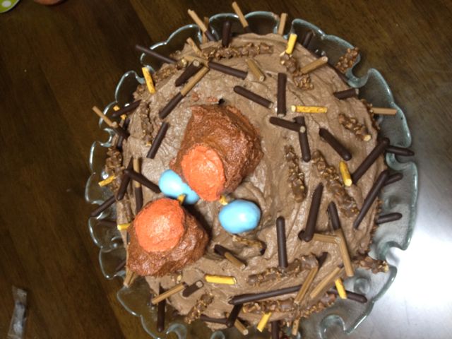 One of the things that I love doing on occasion is making creative cakes. I most enjoy thinking of a theme and figuring out how to make the theme into a cake. While I would hate the pressure of making cakes frequently, doing one a month or so lets my creative juices flow! Eric is also great at assisting- he usually does the cutting and helps me with the design.