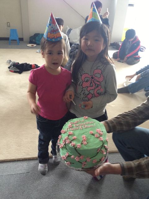 Olivia and her friend Minori share a birthday near each other — and it was celebrated the day we were supposed to go to see the cherry blossoms- but got rained out.