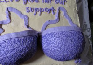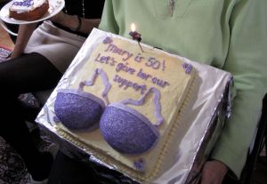 Our friend Mary just celebrated her 50th birthday party. I had a hard idea thinking of a theme for her, and decided she needed an “uplifting” cake for this one. It is one of those cakes that works better in a ladies-only setting perhaps. It was fun because I learned (online) how to create the lacey-look with icing. Our wedding cake had that (in cream-color, not purple!) and I always loved it but didn’t know – until I made this cake- how to do it. One of the funnest things about this birthday party was the reaction of our Japanese friends to this cake… All sixteen or so ladies immediately pulled out their cell phones, gathered around Mary and the cake, and started snapping photos of the bra cake. It was hilarious.