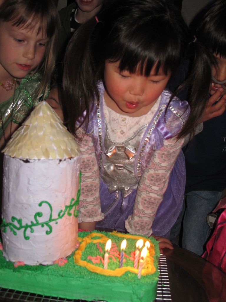 We took the kids to see “Tangled” during spring break when it came out in Japan. Olivia loved it – it was a fun theme for her fifth birthday party. We couldn’t figure out how to make the round tower out of cake… and then I found smallish round cardboard bundt molds at our local hyaku yen (dollar) store. Three of them were perfect for stacking for the tower. Eric made Rapunzel’s face out of buttercream icing (we can’t get fondant here, so we have to make due)…Sliced almonds worked for the roof.