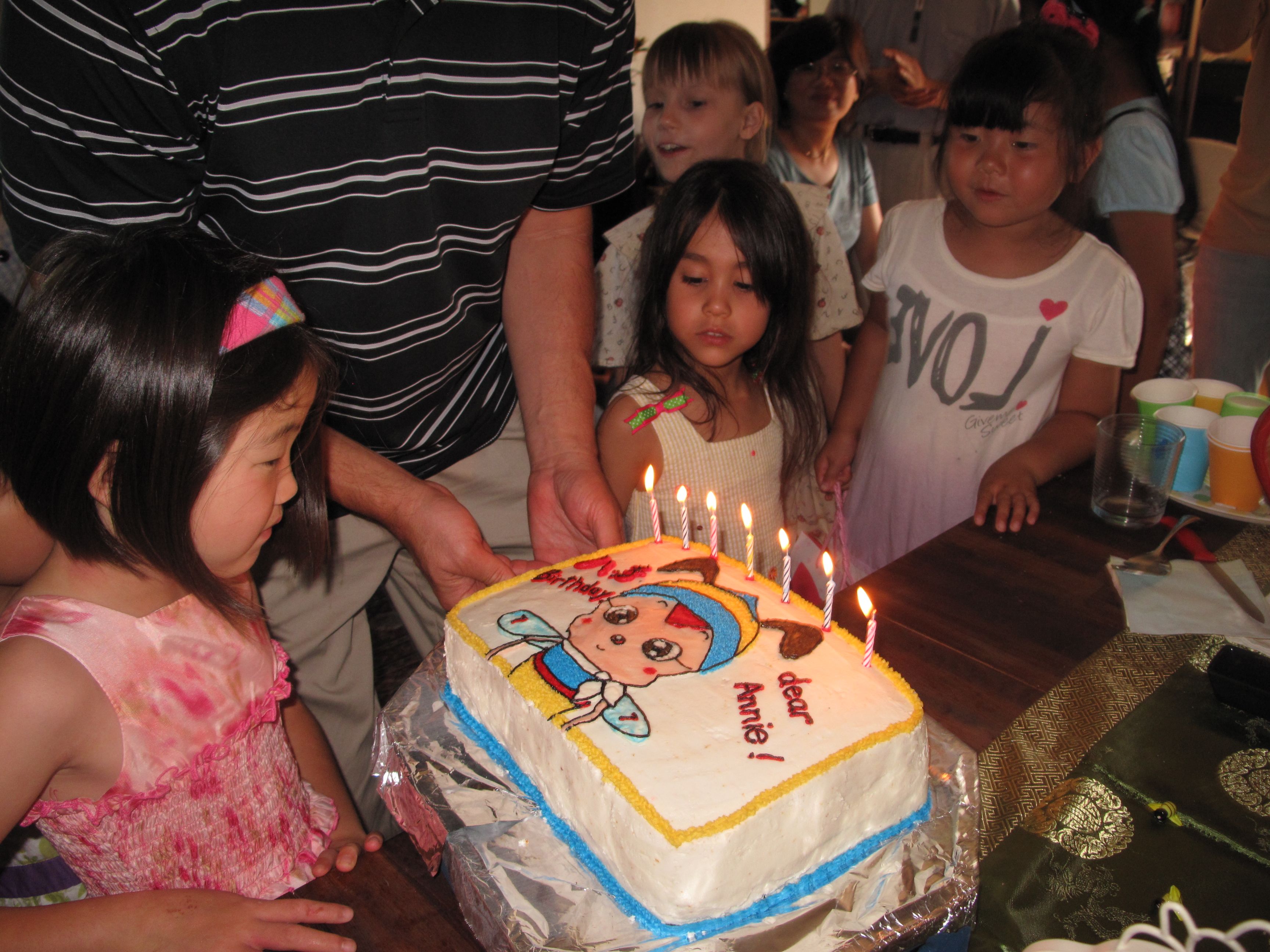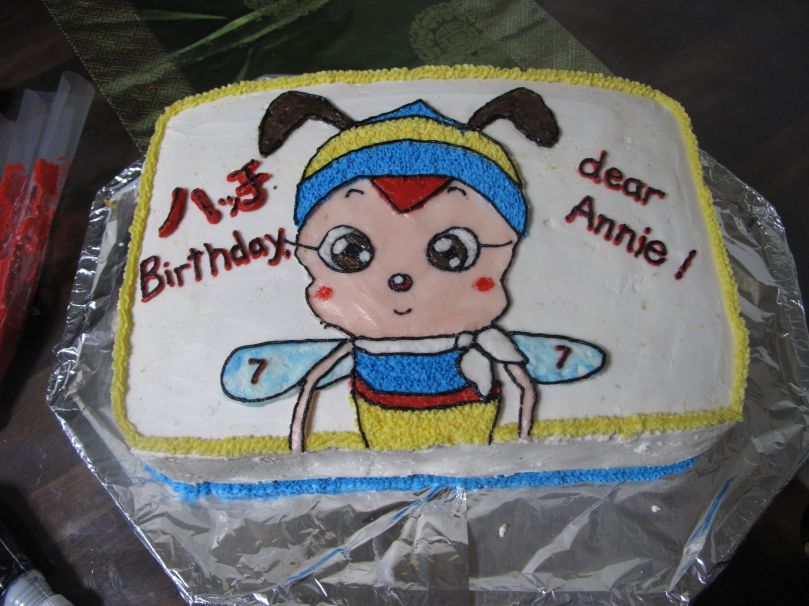Annie decided six months ago that she wanted a “Mitsu-Bachi-Hacchi” theme birthday party. It is an anime movie that came out a few years ago or so here in Japan, but based on a tv cartoon series that used to run thirty five years ago. Annie’s class had done it as a school play- she was the queen bee! I find character cakes can often be the hardest to make. The key is finding a really good picture from the internet, copying it to be the size of the cake, and then cutting it up and tracing pieces of it, when necessary, onto the cake. For this cake, the eyes were the most complicated and took over an hour…