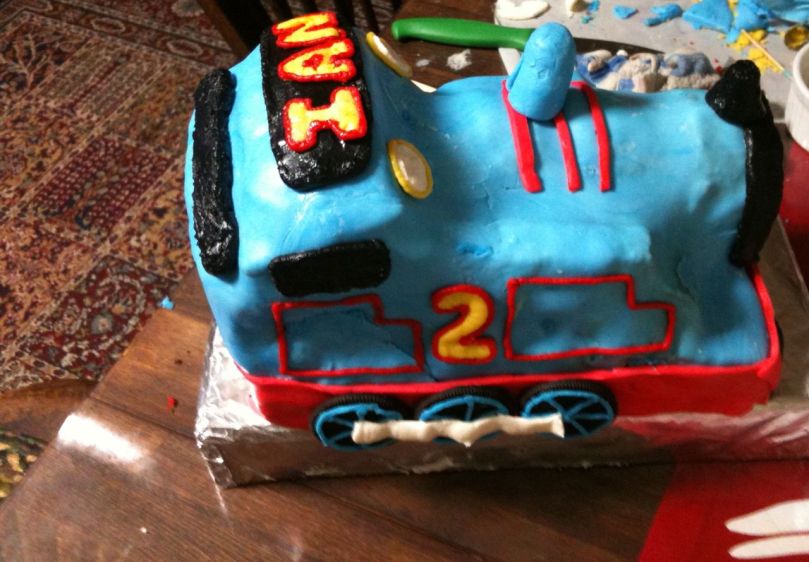 ***Our son Ian – 2 – LOVES Thomas. Any kind of transportation, actually, but in particular – Thomas. I decided to learn how to make fondant, and to try working with it for the first time- to make a real Thomas cake for him. I found some good helps online – managed to scrape together the ingredients to make fondant here in Japan, and gave it a shot. When I went to bed the night before the party – around 2:30 am – I was fairly happy with my first fondant cake…