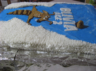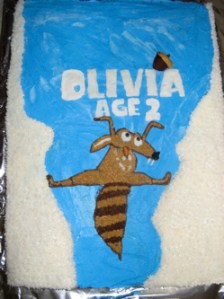 This was for Olivia’s 2nd birthday (see party photos). Her favorite character these days is Scrat from Ice Age, so we had to make a Scrat cake. I made 2 oblong cakes and put them together…Eric trimmed down the height of the blue part between the white ice mountains to make it a bit 3-dimensional. A truffle helped create the acorn.