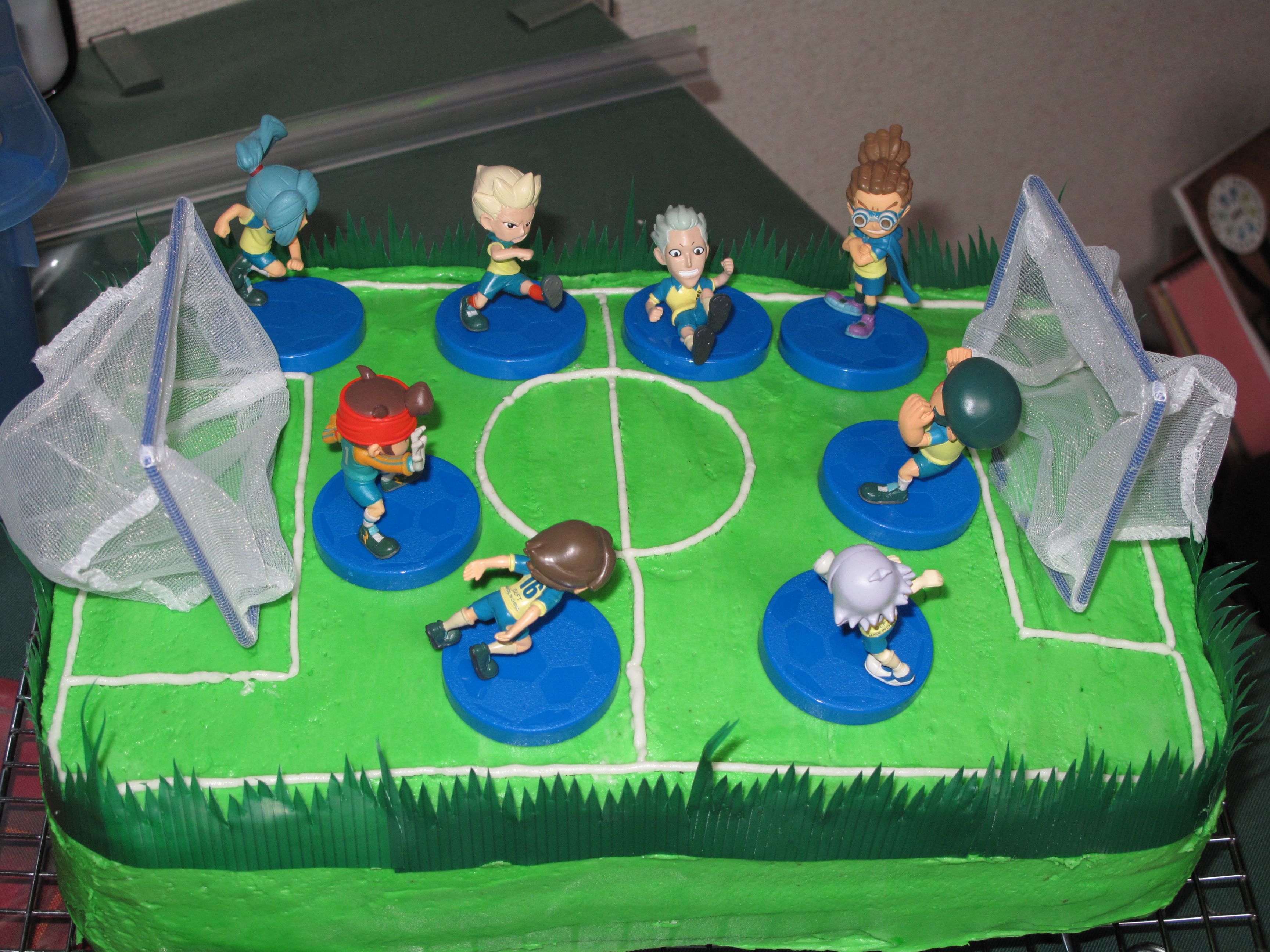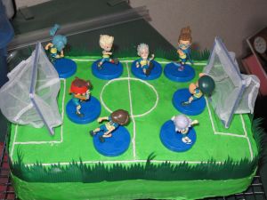 This year Owen wanted a soccer theme based on a popular Japanese soccer anime show on television called Inazuma Eleven. Making a sports field is an easy theme cake to pull off with a 13 x 9 pan. I made a double thick cake to add height, and ordered the soccer characters online. Each of the boys who came got to choose their favorite character to take home with them. The green grass trim is the plastic separators they use on sushi trays; my husband had the great idea of using goldfish nets for the soccer nets.