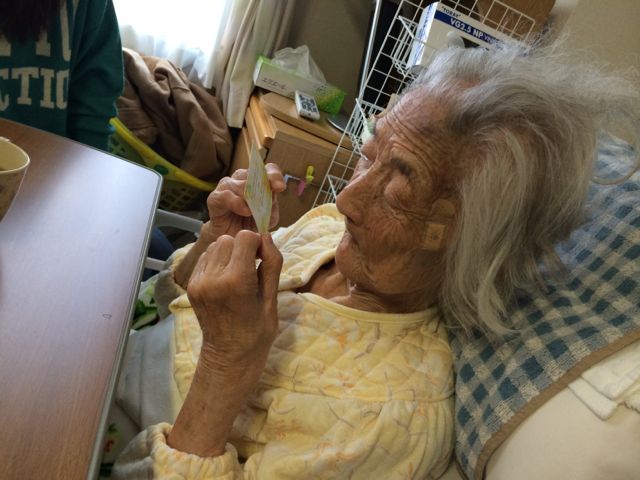 Tomi-san told us several touching stories. She had married and had four children. Two of them died when they were infants. Then her husband went off to the Philippines to fight in WWII against the Americans, and he never came home. Tomi’s one son got mixed up in the wrong crowd, ended up joining a gang, and has never been heard from since. Her remaining child, T’s father, died of cancer at the age of 60. T. has told me previously that on his deathbed he had asked his daughter T. to take care of his mother. T. has faithfully visited her day after day, despite being a single mom with two children and working at the Nozomi Project.